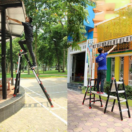 Multi-purpose aluminum ladders have basic structures, super easy for operation, can use 4 different positions as: Double use ladder (A-shape), Extension ladder (I-shape), Staircase – steps ladder and Scaffolding base.